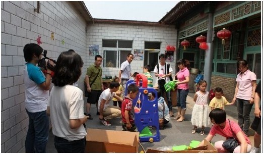 (网友代表与瑞宝员工为孩子们组装玩具)
